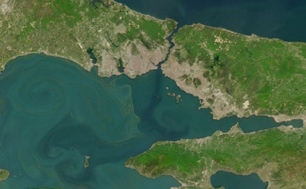 “Hoca’ya da Kanal İstanbul’u bir danışalım dedik aldı bizi Atlantik’e götürdü” demiş olmalısınız ama sistem böyle küresel boyutlarda ve hassas dengelerde çalışıyor. Bir gerçeği daha aydınlatalım. Karadeniz’e giren tüm sular nehir suyu veya yağmur suyu yani tatlı su. Peki Karadeniz neden tuzlu? İşte burada da detaylarını sadece bizim bildiğimiz ama sizlerin de farkına varmadan kullandığınız boğazların alt akıntısı devreye girmekte. İstanbul Boğazı gözlerinizin önünde nasıl akıyor ise görmediğiniz alt tabaka da aynen öyle akıyor, tek bir farkla, ters tarafa yani Karadeniz’e doğru. Hedef basit. Tuz dengesini sağlamak ta ki Karadeniz’de, Akdeniz ile aynı tuzluluğa ulaşana kadar. İyi de bu alt üst akıntı da öyle birbirlerine teğet geçecek şekilde akmıyorlar. İstanbul Boğazı’nın iki yerinde Boğaz’ın dip yapısı nedeni ile karışıyorlar. Biri Hisarlar’ın önünde 110 metre derin çukur nedeni ile diğeri ise Üsküdar Beşiktaş arasında ortada bir bölgedeki sığ tepe yüzünden. Karadeniz’den gelen suyun bir miktarı Akdeniz suyuna karışıyor, Akdeniz’den gelen yoğun su da üst tarafa karışıyor, böylece tuzluluğu biraz daha artan Karadeniz suyu büyük bir hızla Marmara Denizi’ne çıkıyor. İşte bir uydu resmi: