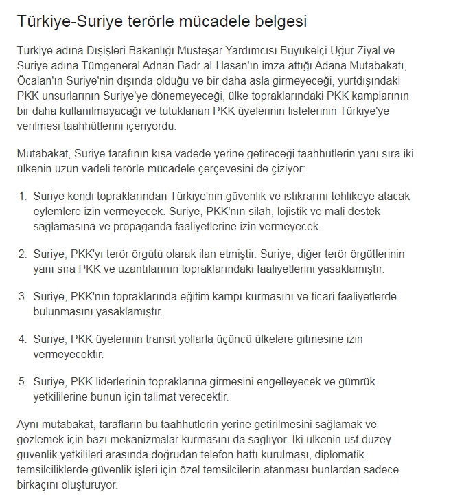 Yapılacak tek şey arşive girip 1998 tarihli Türkiye-Suriye Adana Mutabakatı’nı raftan indirmek ve uygulamaya koymak. Yirmi yıl önce Abdullah Öcalan’ın Suriye’den çıkartılması ve korunup, kollanmasının sonlandırılması amacıyla yazılmış olan bu mutabakatın gereğini yaparak daha az enerjiyle, daha az kan ve can vererek sorunu çözüme kavuşturmak olanağı orada duruyor.
