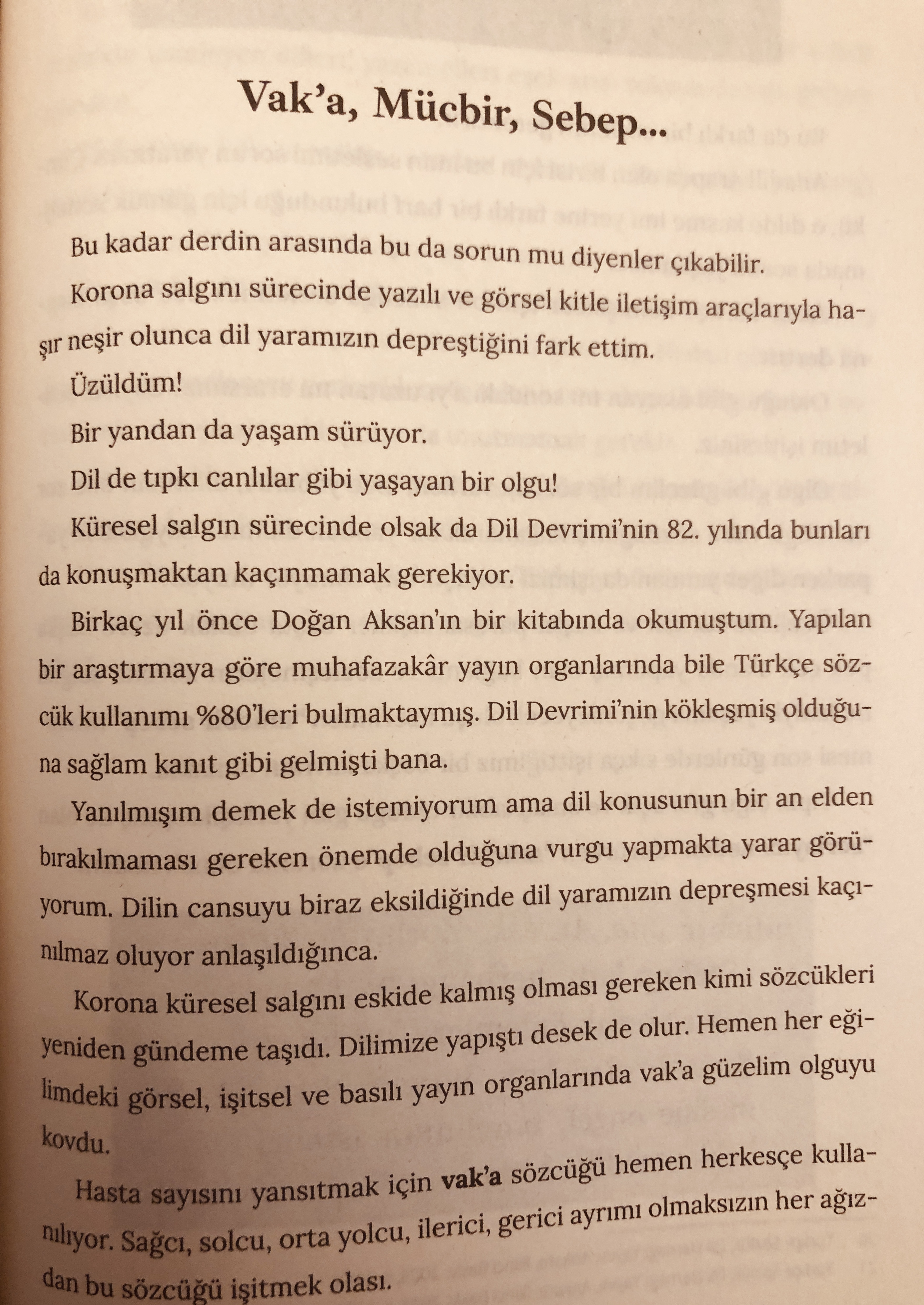 En çok basın ve onlardan da çok hekimler ve elbette akademik çevreler başvurdu bu yabancı ve kulak tırmalayıcı sözcüğe. Sayılabilseydi milyarlarca kez kullanılmış olduğu saptanabilirdi vak’a denen Türkçe olmayan sözcüğün. Her fırsatta ilericilikten, çağdaşlıktan, Cumhuriyetçilikten ve Atatürkçülükten dem vurma gereksinimi içinde olanların vak’a tutkusu bilmem nasıl yorumlanmalı? Türkçemizin bir başka ustası Yunus Emre’ye kulak verip “Sözün us ile düşürgil!” desek yararlı olur mu? Biricik ve paha biçilmez kültürel varlığımız Türkçemiz Dil Bayramı’nın 89. Yılında aydınların, ilericilerin, Cumhuriyetçilerin aymazlığıyla karşı karşıyadır. Okuru daha fazla usandırmadan ikinci örneğe geçmeli!