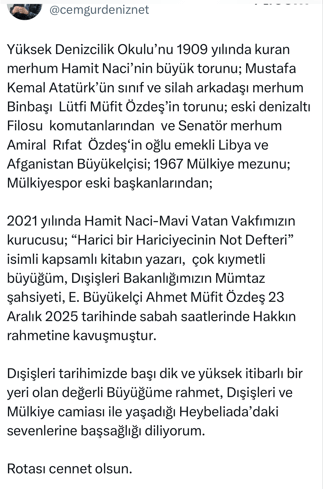 Cem Gürdeniz amiralin paylaşımıyla öğrendik üçüncü kuşak, Ahmet Müfit’in sonsuzluğa göçtüğünü.